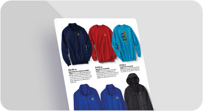 $19.99 ea. Blue Quarter Zip Pullovers Keep warm year-round. This bold and lightweight pullover locks in color and wicks moisture. 100% polyester and screened Arches. Unisex sizes S-3XL. Add $1.00 for 2XL, $3.00 for 3XL. 3221303 • Men’s 3221203 • Ladies’ $24.99 ea. Black Rain Jacket 3221135 • Center front coil zipper with autolock slider. Lower front concealed zippered pockets. Elasticized cuffs and water resistant finish. 100% polyester taffeta. Screened Arches. Unisex sizes available S-3XL. Add $2.00 for 2XL, $3.00 for 3XL. $22.99 ea. Unisex Arches Navy 1/4 Zip Fleece Sweatshirt 3246407 • Perfect for a chilly spring/summer night, this 100% polyester 1/4 Zip Fleece Sweatshirt is a versatile layer you’ll love year-round. Stay cozy and comfortable in any cool-weather setting! Screened Arches. Unisex sizes S-3XL. Add $1.00 for 2XL, $3.00 for 3XL. $17.99 ea. Fry Kids Blue Crew Neck Sweatshirt 3246410 • Keep the crew by your side with this Fry Kids Blue Crew Neck Sweatshirt. Screened design. Unisex sizes available S-3XL. Add $1.00 for 2XL, $3.00 for 3XL. $14.99 ea. Arches Red Crew Neck Sweatshirt 3246408 • Keep cozy and stay green. This Crew Neck Sweatshirt is made from a comfortable 50% USA cotton/50% polyester blend that is 50% sustainably and fairly grown USA cotton. Screened Arches. Unisex sizes available S-3XL. Add $1.00 for 2XL, $3.00 for 3XL. 18 1.800.421.4332