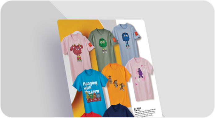 $12.99 ea. Fry Kid T-Shirts The kids are back in town! These colorful Fry Kid t-shirts bring out your inner child. Super soft, 100% combed ringspun cotton. Screened design. Available in unisex sizes S-3XL. Add $1.00 for 2XL, $3.00 for 3XL. 3241418 • Pink 3241417 • Green 3241416 • Blue $9.99 ea. 8-bit T-Shirts Choose your player. These 8-bit t-shirts unlock all three of your favorite characters and meal items. Screened designs. Available in unisex sizes S-3XL. Add $2.00 for 2XL, $3.00 for 3XL. 3241410 • Characters 3241409 • Meal $7.99 ea. Heritage T-Shirts The gang’s all here! These unisex shirts bring the crew together with the colorful Fry Kids and Grimace. Screened designs. Available in unisex sizes S-3XL. Add $1.00 for 2XL, $3.00 for 3XL. 3241405 • Grimace McFlurry 3241408 • Fry Kids Crew 3231404 • Hamburglar 6 1.800.421.4332