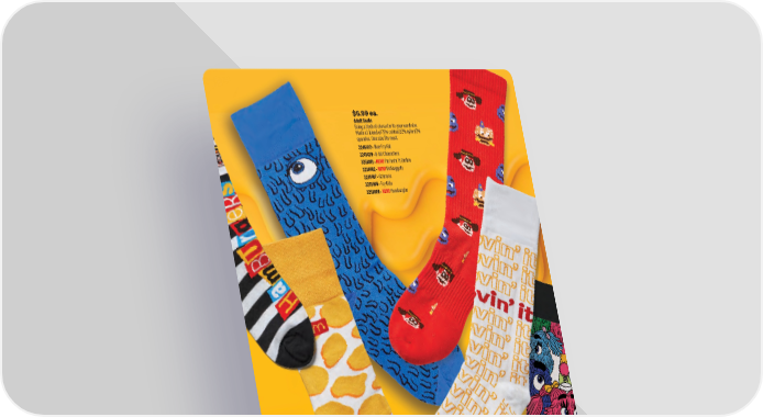 $6.99 ea. Adult Socks Bring a flash of character to your wardrobe. Made of blend of 75% cotton/22% nylon/3% spandex. One size fits most. 3246412 • Blue Fry Kid 3241420 • 8-bit Characters 3251401 • NEW! i’m lovin’ it Ombre 3251402 • NEW! McNuggets 3231407 • Grimace 3231406 • Fry Kids 3251400 • NEW! Hamburglar 29 smkr.shop/s25