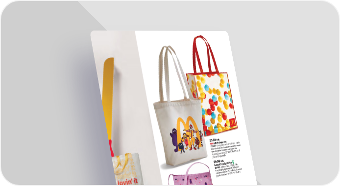 $2.99 ea. Arches Multi-Purpose Bag 7221156 • Always ready to carry. A multipurpose bag with die cut handles for easy carrying. Made of PVC. Spot Clean/Air Dry. Screened Arches. Measures 8" H x 9-¾" H. $3.99 ea. NEW! Ball Pit Shopper Tote 2251404 • Carry your essentials with ease—and a little extra fun! This durable laminated non-woven tote with printed design is as stylish as it is functional, measuring 12" W x 13"H x 8"D for all your on-the-go needs. $9.99 ea. Grimace McFlurry rPET Tote 2241402 • Always be prepared with this tote that folds away in moments. An internal bag works as a storage bag when it is not in use and serves as an extra compartment when it is. Printed in full dye sublimated color. Measures 11-3/8" W x 19-3/8" H x 5-1/2" D. $9.99 ea. McDonald’s Family rPET Tote 2231403 • Reduce, reuse, recycle. This heavyweight poly material is 100% post- consumer recycled rPET material. Screened graphic. Measures 13-½" H x 16" W x 4" D. $12.99 ea. NEW! Egg McMuffin Quarter Pounder with Cheese Tote 2251405 • Breakfast love on one side, dinner time love on the other. This pigment dyed canvas tote has nylon handles. Measures 16” W x 13-1/2” H x 4” D. $11.99 ea. NEW! i’m lovin’ it Grid Vinyl Tote 2251403 • Share the love wherever you go. Grid vinyl tote with nylon handles and printed decoration. Measures 19” W x 14” H x 5-1/2” Drop. $12.99 ea. NEW! Heritage Logo Tote 2251402 • Respect the classics with this stylish tote. Pigment dyed canvas tote with nylon handles and front pocket. Measures 2-1/2” W x 14” H (Bag), 10-1/2” on the tall side, 8” on the short side (Pocket). 31 smkr.shop/s25