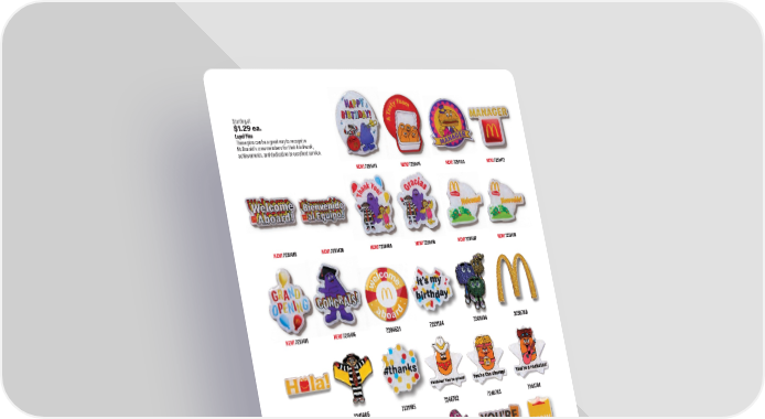 7246702 7204621 7204641 7246703 7221105 7221104 7226712 7226718 7246704 3236700 3236701 7241401 7241405 7241407 7241404 7196020 NEW! 7251415 NEW! 7251414 NEW! 7251417 NEW! 7251418 NEW! 7251419 NEW! 7251420 NEW! 7251409 NEW! 7251410 NEW! 7251411 NEW! 7251416 NEW! 7251413 NEW! 7251412 Starting at $1.29 ea. Lapel Pins These pins can be a great way to recognize McDonald’s crew members for their hard work, achievements, and dedication to excellent service. $3.99 ea. NEW! McNuggets Happy Birthday Pin Card 7251400 • This pin card is the perfect way to recognize someone’s special day. It includes three McNugget pins and room to add a personal message on the back. 21 smkr.shop/s25