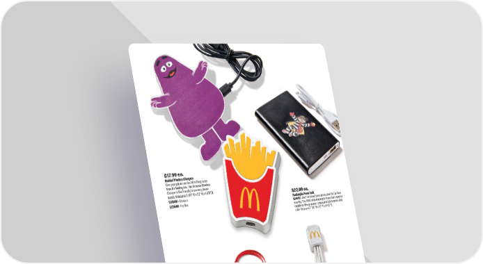 $17.99 ea. Molded Wireless Chargers Give your phone an electrified hug every time it’s feeling low. The Grimace Wireless Charger is the friendly face every phone needs. Measures 3-1/4" W x 1/2" H x 4-1/4" D. 5241401 • Grimace 5231400 • Fry Box $6.49 ea. Arches 4-in-1 Charging Stand 5246704 • Stay prepared on the go. The Arches 4-in-1 Charging Cable has a USB/USB-C to Micro-USB/ Lightning/USB-C cord that supports most Androids and Apple devices along with a built in mirror and phone stand. Screened Arches. $5.99 ea. Arches 3-in-1 Charging Buddy 5246703 • Be ready for anything with the Arches 3-in-1 Charging Buddy. Comes with a USB to Lighting/ MicroUSB/USB-C type chargers. Supports all Apple and most Android phones. Screened Arches. $22.99 ea. Hamburglar Power Bank 5246701 • Don’t let a dead smartphone steal the fun from your day. This 4000 mAh Hamburglar Power Bank supplies reliable on-the-go-power. Comes with USB to micro-USB cable. Measures 2-3/4” W x 1/2” H x 4-1/3” D. 38 1.800.421.4332