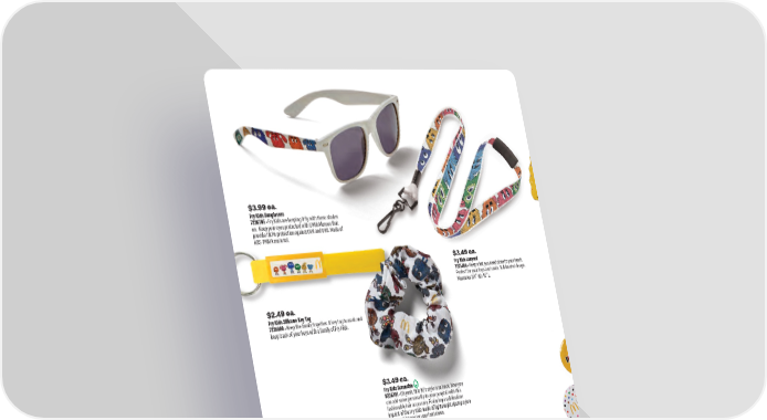 $3.99 ea. Fry Kids Sunglasses 7236705 • Fry Kids are keeping it fly with these shades on. Keep your eyes protected with UV400 lenses that provide 100% protection against UVA and UVB. Made of ABS-PMMA material. $5.99/5 pk. Silicone Bracelets 7241406 • Bring back what brought us together. These silicone bracelets share good feelings with everyone on the team. White print on engraved bright fluorescent bands. $3.49 ea. Fry Kids Scrunchie 9236701 • Oh yeah, this 90’s style is so back. Now you can add some personality to your ponytail with this fashionable hair accessory. Featuring a sublimation imprint of the Fry Kids made of lightweight ripstop nylon that won’t let you (or your hair) down. $2.49 ea. Fry Kids Silicone Key Tag 7231400 • Keep the family together. A key tag to mark and keep track of your keys with a family of Fry Kids. $3.49 ea. Fry Kids Lanyard 7231404 • Keep what you need close to your heart. Perfect for your keys and cards. Sublimated design. Measures 3/4” W x 16” L. $1.99 ea. Translucent Arches Sunglasses 7221155 • Look fly and keep your eyes protected with UV400 lenses. Provide 100% protection against UVA and UVB. Made of ABS-PMMA material. Screened Arches. 42 1.800.421.4332