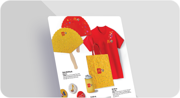 $8.99 ea. Pride T-Shirt 3241423 • Celebrate who you are. This Pride t-shirt is great for every him, her, and them. Screened design. Made of 100% pre-shrunk cotton. Unisex sizes S-3XL. Add $1.00 for 2XL, $3.00 for 3XL. $1.99 ea. Pride Can Cooler 6246703 • Be proud, stay cool. The Pride Can Cooler keeps your drink cold and your day vibrant. Sublimated design. $6.99 ea. Pride Tote 2241406 • You do you. This Pride Tote is the perfect bag to carry everything you need while showing your true colors. Sublimated design. Measures 13-1/2" W x 14" H x 13" D. $2.99 ea. Arches Mirrored Sunglasses 7241409 • Look fly. With a golden sheen, these mirrored glasses keep you looking your best in the face of the summer sun. Golden Arches screened on red translucent frames. $44.99/50 pk. Pride Fans 7241420 • Stay cool, stay proud. These Pride Fans come in packs of 50, and are sure to add the bright voice that your event needs. $4.99/6 pk. Pride Buttons 7241421 • Live your truth. These Pride Buttons come in a pack of 6 and are perfect for adding that extra pop of color to any outfit. 43 smkr.shop/s25