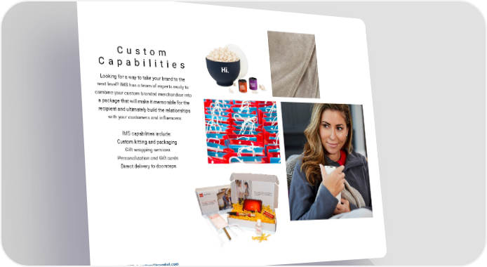 Custom Capabilities Looking for a way to take your brand to the next level? IMS has a team of experts ready to combine your custom branded merchandise into a package that will make it memorable for the recipient and ultimately build the relationships with your customers and influencers. IMS capabilities include: Custom kitting and packaging Gift wrapping services Personalization and Gift cards Direct delivery to doorsteps 28 1.800.421.4332 / [email protected]