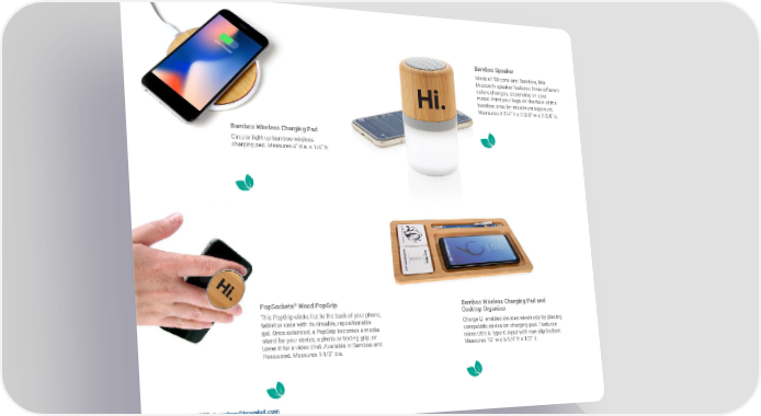Bamboo Speaker Made of Silicone and Bamboo, this bluetooth speaker features three different colors changes, depending on your mood. Print your logo on the face of the bamboo area for maximum exposure. Measures 4-1/4" h x 2-3/8" w x 2-3/8" d. Bamboo Wireless Charging Pad Circular light-up bamboo wireless charging pad. Measures 4" dia. x 1/4" h. ® PopSockets Wood PopGrip Bamboo Wireless Charging Pad and This PopGrip sticks flat to the back of your phone, Desktop Organizer tablet or case with its rinsable, repositionable Charge QI enabled devices wirelessly by placing gel. Once extended, a PopGrip becomes a media compatible device on charging pad. Features stand for your device, a photo or texting grip, or micro USB & Type-C input with non-slip bottom. lower it for a video chat. Available in Bamboo and Measures 10" w x 5-1/4" h x 1/2" d. Rosewood. Measures 1-1/2" dia. 16 1.800.421.4332 / [email protected]