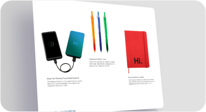 Translucent Writerâ„¢ Pen Translucent slim line and matching ribbed rubber grip. Ultrasmooth writing black ink. Measures 3/8" diameter x 5-3/5" L. Snap Fast Wireless Power Bank Stand Kit Neo Non-Woven Journal This charger includes a high-speed wireless power Matching bookmark and elastic strap closure bank, a UL Listed AC adapter, and a stand with adorn this 80 page lined notebook. Non-woven integrated USB/USB-C cable. polypropylene cover. Measures 5" w x 7" h. 8 1.800.421.4332 / [email protected]