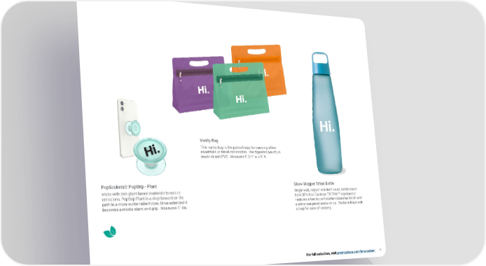 Vanity Bag This vanity bag is the perfect size for carrying office essentials or travel necessities. The zippered pouch, is made of soft PVC. Measures 9-3/4" w x 8" h. PopSocketsĀ® PopGrip - Plant Show Stopper Tritan Bottle Made with 35% plant-based materials to reduce Single wall, impact resistant 24 oz. bottle made emissions, PopGrip Plant is a step forward on the from BPA-free Eastman TRITAN TM copolyester. path to a more sustainable future. Once extended it Features a translucent matte rubberized finish with becomes a media stand and grip. Measures 1" dia. a shiny leak-proof screw-on lid. The lid is fitted with a loop for ease of carrying. For full selection, visit promoplace.com/imscustom 9