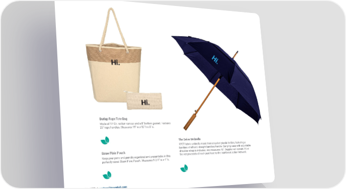 Burlap Rope Tote Bag Made of 12 Oz. cotton canvas and a 8" bottom gusset. Features 25" rope handles. Measures 19" w x 15" h x 8" d. The Selva Umbrella RPET fabric umbrella made from recycled plastic bottles, featuring a bamboo shaft and straight bamboo handle. Carrying case with adjustable Straw Pixie Pouch shoulder strap is included. Arc measures 48". Supplier will donate 1% of Keep your pens and pencils organized and presentable in this the net proceeds of each purchase to the Rainforest Action Network. perfectly-sized Straw Pixie Pouch. Measures 9-3/4" w x 4" h. 12 1.800.421.4332 / [email protected]