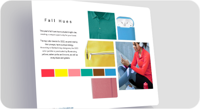 Fall Hues This year’s fall hues have a muted bright vibe, creating a unique opportunity for your brand. The top color trends for 2022, as predicted by the runways, have a unique energy. According to fashion’s top designers, the 2022 color palette is punctuated by illuminating yellows, ashen pinks and browns, as well as misty blues and greens. 4 1.800.421.4332 / [email protected]