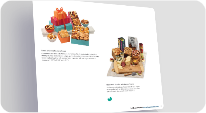 Sweet & Savory Crunchy Tower Contained in the three colorful boxes is a variety of tasty treats, including tart fruit medley, crunchy snickerdoodle crisps, and fresh-roasted deluxe mixed nuts. Reusable boxes are tied together with orange ribbon imprinted with your logo. Serves 8-12. Measures 7-3/8" l x 7-3/8" w x 6-3/4" h. Charcuterie Sampler with Bamboo Board The bamboo cutting board, firebranded with your imprint, comes packed with all of the delicious snack sensations you could want! Measures 12" L x 8" w x 3/4" h. For full selection, visit promoplace.com/imscustom 25