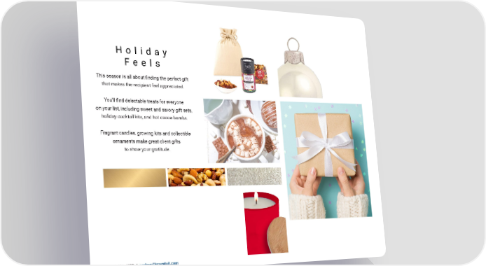 Holiday Feels This season is all about finding the perfect gift that makes the recipient feel appreciated. You'll find delectable treats for everyone on your list, including sweet and savory gift sets, holiday cocktail kits, and hot cocoa bombs. Fragrant candles, growing kits and collectible ornaments make great client gifts to show your gratitude. 22 1.800.421.4332 / [email protected]