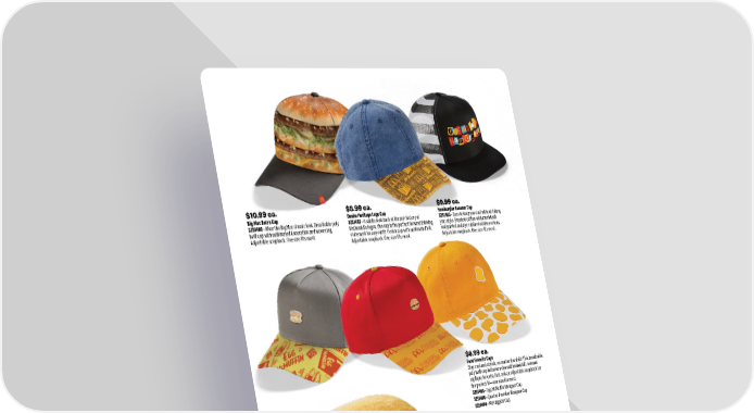 $9.99 ea. Hamburglar Ransom Cap 3251403 • Sure to keep you cool without taking your style. Brushed cotton with mesh back and printed and dye sublimated decorations. Adjustable snapback. One size fits most. $7.99 ea. Grimace Cap 3231411 • Sport your favorite purple fur-covered pal. 100% cotton cap with embroidered artwork on cap and adjustable closure. One size fits most. $10.99 ea. Big Mac Retro Cap 3251408 • Wear the Big Mac classic look. Breathable poly twill cap with sublimated decoration and woven tag. Adjustable snapback. One size fits most. $8.99 ea. Denim Heritage Logo Cap 3251407 • A subtle look back at the rich history of McDonald’s logos, this cap is the perfect forward thinking statement for any outfit. Denim cap with sublimated bill. Adjustable snapback. One size fits most. $6.99 ea. Food Favorite Caps Stay cool and stylish, no matter the shift! This breathable poly twill cap features a dye sublimated bill, a woven applique for extra flair, and an adjustable snapback for the perfect fit—one size fits most. 3251405 • Egg McMuffin Wrapper Cap 3251406 • Quarter Pounder Wrapper Cap 3251404 • McNuggets Cap $10.99 ea. Token Terry Bucket Hat 3251409 • Top off your look with a hat that’s as cool as you are! This Terry Cloth Bucket Hat features a woven applique decoration and a comfy fit—one size fits most. 29 smkr.shop/F25