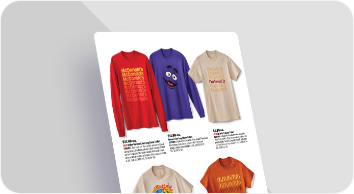 $11.99 ea. Grimace Face Long Sleeve T-Shirt 3246405 • Capture the character of our purple friend with this Grimace long sleeve cotton t-shirt. Screened design. Unisex sizes available S-3XL. Add $1.00 for 2XL, $3.00 for 3XL. $7.99 ea. NEW! Repeating Retro Arches Brown T-Shirt 3256407 • Nostalgia you can see, quality you can feel. Made with 100% U.S. cotton. Classic fit with rib collar. Features screened retro repeating Arches. Unisex sizes available S-3XL. Add $1.00 for 2XL, $3.00 for 3XL. $9.99 ea. NEW! McDonaldland Cream T-Shirt 3256417 • Throwin’ it back to McDonaldland and Grimace, this tee hits the sweet spot between vintage vibes and classic cool. Made from 100% cotton. Screened design on front. Unisex sizes available S-3XL. Add $1.00 for 2XL, $3.00 for 3XL. $11.99 ea. NEW! Ombre Wordmark Red Long Sleeve T-Shirt 3256422 • This is the tee that speaks volumes without saying much. A red long-sleeve t-shirt is made of 100% cotton. Featuring the unmistakable McDonald’s logo screened in an ombre technique. Unisex sizes available S-3XL. Add $1.00 for 2XL, $3.00 for 3XL. $6.99 ea. NEW! i’m lovin’ it Cream T-Shirt 3256419 • A staple for brand lovers and crew alike. Made from 100% cotton, this cream tee features the unmistakable i’m lovin’ it repeat artwork. Screened on front. Unisex sizes available S-3XL. Add $1.00 for 2XL, $3.00 for 3XL. 4 1.800.421.4332