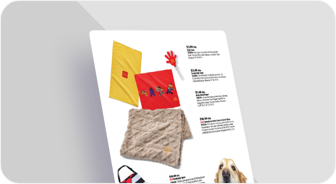 $19.99 ea. NEW! Hamburglar Apron 3251430 • This bib-style apron is made of 100% polyester and features adjustable neck and waist ties to make sizing a cinch, along with two patch pockets for storage. Edge to edge sublimation printing in the Hamburglar’s signature stripes and tie. Measures 27" W x 31" H. $1.49 ea. Arches Hand Clapper 7246710 • Let your team know you’re always cheering them on. The Arches Hand Clapper is perfect for bringing the energy. Screened Arches. Measures 3-3/4" W x 7-1/2" H x 3/4" D. $3.99 ea. Rally Towel 7226704 • Wave your crew colors with this gold rally towel. The microfiber cloth features a screened Token. Measures 11" W x 18" H. $3.49 ea. Parade Rally Towel 7246709 • The McDonald’s Family has your back. The Parade Rally Towel is what your team cheers are missing! Sublimated design. Measures 13" W x 16" H. $3.99 ea. NEW! Hamburglar Ransom Note Bandana 3251431 • Who doesn’t want to steal a delicious hamburger? This 100% polyester bandana lets the whole family in on the delicious action. Measures 21-1/2" W x 21-1/2" H. $16.99 ea. NEW! Embroidered Arches Cream Textured Throw 9256714 • Get ready for cooler days ahead with this cozy sherpa fleece. This super soft feeling blanket is made from post consumer recycled materials (rPET). Features embroidered arches on corner. Measures 48"W x 63"H. 44 1.800.421.4332