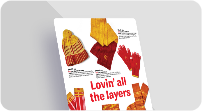 $10.99 ea. NEW! Color-Block Knit Pom Beanie 3256428 • Keep your head warm and your style cool. This soft, custom-knit pom beanie features a token tag cuff. One size fits most. Wipe with damp cloth and air dry to clean. $14.99 ea. NEW! Color-Block Knit Scarf 3256430 • Bundle Up! Winter’s no match for this cozy knit scarf. Featuring gold and red colorblock. Embroidered Arches. One size fits most. Measures 15-1/2"W x 70" L. $9.99 ea. NEW! Color-Block Knit Gloves 3256429 • A snug fit with soft gloves is just what you need to get through any Winter season. Features embroidered Arches. One size fits most. Wipe with damp cloth and air dry to clean $7.99 ea. NEW! Repeating Retro Arches Brown Socks 3256400 • Share your love for the Fall season with this retro design. Made from a comfy blend of Cotton, Nylon, and Spandex. Features retro repeating Arches using woven technique. Decorated edge to edge. One size fits most. $11.99 ea. NEW! Repeating Retro Arches Brown Scarf 3256425 • These scarves are made using 100% acrylic yarn and are an excellent wearable solution for wintertime. Features retro repeating Arches. One size fits most. Measures 8" W x 55" L. $4.99 ea. NEW! Colorblock Knit Socks 3256431 • Walk boldly — these socks don’t do subtle. These color-block knit socks are made from 100% cotton. Features sewn-on token tag along top edge. One size fits most. Machine wash cold with like colors. 30 1.800.421.4332 Lovin’ all the layers