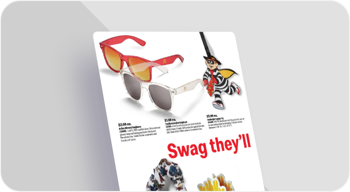 $5.99 ea. Hamburglar Luggage Tag 4241405 • With the Hamburglar watching your back, you can be sure nobody steals the wrong bag. Full color silicone. Measures 4-1/10" W x 2-4/5" H x 8" D. $3.49 ea. Scrunchies The perfect scrunchie to keep your eyes clear when on the job. Every one of these scrunchies keeps .32 bottles out of the landfill. Sublimated pattern. 7241411 • Arches 9236701 • Fry Kids $2.99 ea. Arches Mirrored Sunglasses 7241409 • Look fly. With a golden sheen, these mirrored glasses keep you looking your best in the face of the summer sun. Golden Arches screened on red translucent frames. $1.99 ea. Translucent Arches Sunglasses 7221155 • Look fly and keep your eyes protected with UV400 lenses. Provide 100% protection against UVA and UVB. Made of ABS-PMMA material. Screened Arches. Swag they’ll $5.99 ea. NEW! Fry Box Claw Clip 7256715 • Craving style? This clip’s got you. Made in the shape of the classic McDonald’s Fry box, this plastic claw clip is one everyone’s going to want. 40 1.800.421.4332