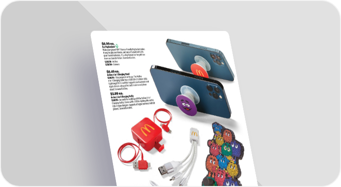 $6.49 ea. Arches 4-in-1 Charging Stand 5246704 • Stay prepared on the go. The Arches 4-in-1 Charging Cable has a USB/USB-C to Micro-USB/ Lightning/USB-C cord that supports most Androids and Apple devices along with a built in mirror and phone stand. Screened Arches. $5.99 ea. Arches 3-in-1 Charging Buddy 5246703 • Be ready for anything with the Arches 3-in-1 Charging Buddy. Comes with a USB to Lighting/MicroUSB/ USB-C type chargers. Supports all Apple and most Android phones. Screened Arches. $22.99 ea. Hamburglar Power Bank 5246701 • Don’t let a dead smartphone steal the fun from your day. This 4000 mAh Hamburglar Power Bank supplies reliable on-the-go-power. Comes with USB to micro-USB cable. Measures 2-3/4" W x 1/2" H x 4-1/3" D. $6.99 ea. Eco PopSockets® Make your phone POP! This eco-friendly PopSocket makes it easy to grip your device, and since it's made with 35% plant-based materials, it's a step forward on the path to a more sustainable future. Screened Arches. 5226701 • Arches 5236704 • Grimace $12.99 ea. Fry Kids Phone Stand 5241400 • Stay hands-free with the help of the Fry Kids. This phone stand works for most phones and keeps your screen at the perfect angle. Measures 3" W x 4-3/4" H x 3-1/4" D. 39 smkr.shop/F25