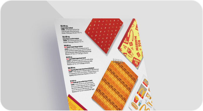 $5.99 ea. Cropped Arches Notebook 1231401 • Jot that down! You'll never lose a great idea again in these lined journals. Includes 70 lined pages. Measures 5" W x 7" H. $4.49 ea. Perfect Bound Icon Print Notebooks 1226702 • Don’t let those great ideas stop! Includes 70 lined pages. Measures 5" W x 7" H. $10.99 ea. NEW! Quarter Pounder Wrapper Task Pad 1251432 • Screen-printed task pad featuring the Quarter Pounder with Cheese wrapper design, perfect for any kind of quick and easy note-taking. Red tape binding along top edge. Measures 5-1/2" W x 8-1/2" H (136 pages / 68 sheets). $9.99 ea. NEW! Egg McMuffin Wrapper Bound Journal 1251433 • Egg McMuffin wrapper printed journal with red tape binding. Perfect for any kind of quick and easy note-taking! Measures 5-1/4" W x 7-3/4" H (136 pages / 68 sheets). $7.99 ea. NEW! Hamburglar Ransom Note Square Notebook 1251431 • The lay-flat ease of a coil-bound notebook, perfect for any kind of quick and easy note-taking. Fun, red coil and custom printed “Give Me Your Hamburgers” ransom note message on the Hamburglar stripe. Measures 5-1/4" W x 5-1/4" H; 68 Sheets (136 Pages). $8.99 ea. NEW! Repeating Retro Arches Brown Corner Coil Notebook 1256701 • The lay-flat ease of a coil-bound notebook without the hassle of having your hand hit the coils. 68 Sheets (136 pages). Features retro repeating Arches on front & back. Measures 5-1/2" W x 8-1/2" H. 36 1.800.421.4332