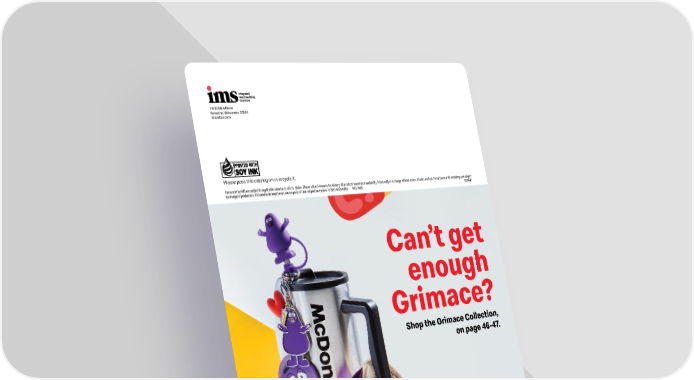 10% OFF SAVE YOUR FIRST ORDER Enter Code:FALL25 Items sold by IMS are subject to applicable sales tax in all U.S. States. Please allow 3-4 weeks for delivery. All products based upon availability. Prices subject to change without notice. All sales are final. Products are artist renderings and subject to change in production. All trademarks used herein are property of their respective owners. © 2025 McDonald’s MCD_Fall25 S171617 10100 58th Place Kenosha, Wisconsin 53144 imsretail.com Please pass this catalog on or recycle it. Can’t get enough Grimace? Shop the Grimace Collection, on page 46-47.
