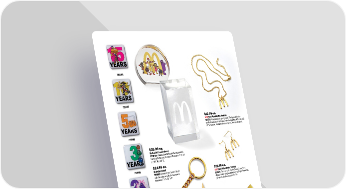 7251422 7251421 7196020 $24.99 ea. 3D Arches Award 9196002 • Reward your team’s talent with this clear acrylic Arches award. Measures 2" x 3-1/8" x 2". $28.99 ea. McDonald’s Family Award 9236710 • Celebrate with the whole McDonald’s family with this acrylic award. Measures 2-1/4" W x 2-1/4" H x 3/4" D. 7251403 7251402 7251404 7251405 7251406 7251407 7251408 $4.99 ea. Arches Star Keychain 7241412 • Be the star that you are. With the glimmer of this Arches Star Keychain, you’re sure to work your way to the top in no time. $1.29 ea. Employee Recognition Lapel Pins These pins can be a great way to recognize McDonald’s crew members for their hard work, achievements, and dedication to excellent service. $12.99 ea. NEW! Gold Plated Arches Necklace 9256713 • Ba da ba ba ba, you’re stylin’. Gold plated Arches pendant necklace is packaged in a velvet gift box. 18" chain with a 2" extension. Pendant measures 3/4" H. One size fits most. $12.99 ea. NEW! Gold Plated Arches Earrings 9256712 • Serving style, the McDonald’s way. Gold plated Arches dangle earrings are packaged in a velvet gift pouch. Arches measure 3/4"H". $7.99 ea. NEW! Gold Plated Arches Tie Bar 7256713 • The cherry on top for any formal outfit! Gold plated Arches tie bar is packaged in a padded clear gift box. Measures 2"L x 1/5"W, Arches are 3/4" H. 23 smkr.shop/F25