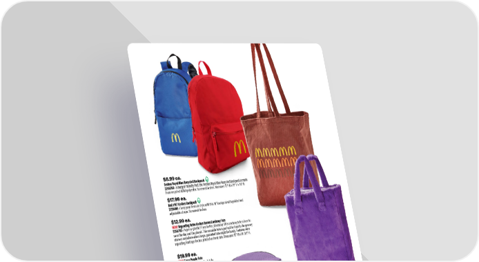 Starting at $8.99 ea. NEW! Modular Travel Pouches Printed modular zipper pouches. Built for organization and ready to be filled with anything you need on the go. Grab all 3 characters for a full set! 2251431 • Small Birdie 2251432 • Medium Hamburglar 2251433 • Large Grimace $17.99 ea. Red rPET Arches Backpack 2231400 • Carry your items in style with this 16" backpack with padded and adjustable straps. Screened Arches. $8.99 ea. Arches Royal Blue Recycled Backpack 2246703 • A budget-friendly find, the Arches Royal Blue Recycled Backpack is made from recycled 600d polyester. Screened Arches. Measures 13" W x 22" H x 16" D. $12.99 ea. NEW! Repeating Retro Arches Brown Corduroy Tote 2256703 • Paper or plastic? Even better, Corduroy! This corduroy tote is here to save the day and the planet. This reusable tote is perfect for trips to the grocery store or anywhere else a large, gusseted tote might be handy. Features retro repeating heritage Arches printed on front side. Measures 13" W x 14-3/4" H. $19.99 ea. NEW! Furry Purple Tote 2256705 • Tote-ally purple, totally for you. This Grimace-inspired furry purple tote features can hold everything you need for the day. Features an interior pocket and sewn-on token tag. Measures 15" W x 13" H x 5" D. 33 smkr.shop/F25
