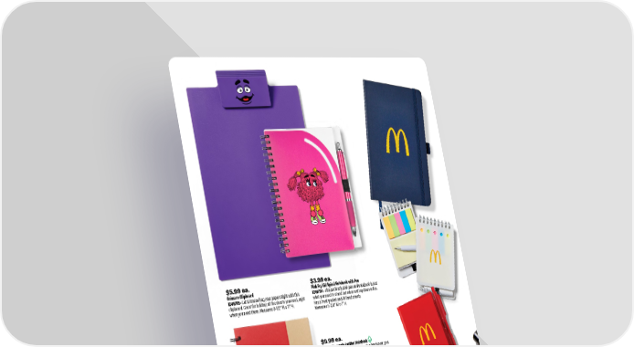 $1.49 ea. Green Fry Kid Spiral Flip Pad 1246702 • The perfect home for every spark of brilliance, this Green Fry Kid Spiral Flip Pad is a great pocket-sized notepad for every idea that comes your way. Full color design. Measures 3" W x 5" H. $9.99 ea. Arches Pineapple Leather Notebook 1241400 • Keep it fruity. With not only a hardcover, pen loop, and page marker included, this notebook is made with 30% sustainable pineapple components. Mark it down and keep it green. 1% of profits go to environmental nonprofits. Measures 5-1/2" W x 8-1/2" H. $2.99 ea. Spiral Jotter Set 1231403 • Keep everything in order. Sticky flags in five fun neon colors. PVC cover and matching shorty pen with flip clip in elastic pen loop. Measures 3-1/2" W x 5-1/4" H. $2.99 ea. Arches Red Translucent Jotter with Pen 7246705 • Keep it all together. This Arches Red Translucent Jotter comes with a matching pen and is great for getting your thoughts down wherever you are. 80 lined sheets. Measures 3-3/8" W x 4-1/8" H x 1/4" D. $3.99 ea. Pink Fry Kid Spiral Notebook with Pen 1246704 • This perfectly pink pen and notebook is just what you need to stand out when writing down notes. Has a front pocket and 70 lined sheets. Measures 5-3/4" W x 7" H. $5.99 ea. Grimace Clipboard 1246705 • Let Grimace hug your papers tight with this clipboard. Great for holding all the sheets you need, right when you need them. Measures 8-1/2" W x 11" H. $2.99 ea. Arches Red Recycled Magnetic Journal 1246700 • Stay organized the sustainable way. Made of various recycled materials, this Magnetic Journal comes with a magnetic clasp, sticky sheets, sticky flags, and 70 lined sheets of paper. Screened Arches. Measures 5-3/4" W x 7-1/4" H. 38 1.800.421.4332