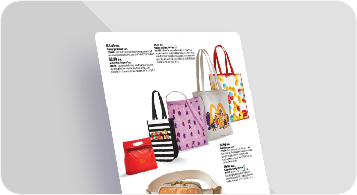 $3.49 ea. Hamburglar Ransom Tote 2251400 • Take what you need wherever you go. Laminated non-woven printed tote. Measures 9 1/4" W x 11 3/4" H x 4-1/2". $14.99 ea. Big Mac Hip Pack 2231401 • Live the Big Mac life. Includes two zippered pockets. You’ll have everything you need safely secured to you with no extra baggage. Measures 6-1/4" W x 4" H x 2" D. $4.99 ea. Grimace Hip Pack 2236712 • Stay hip. This Grimace hip pack keeps what you need on hand and within reach. Screened design. Measures 13"W x 5-1/2"H. $2.99 ea. Arches Multi-Purpose Bag 7221156 • Always ready to carry. A multipurpose bag with die cut handles for easy carrying. Made of PVC. Spot Clean/Air Dry. Screened Arches. Measures 8" H x 9-3/4" H. $3.99 ea. Ball Pit Shopper Tote 2251404 • Carry your essentials with ease—and a little extra fun! This durable laminated non-woven tote with printed design is as stylish as it is functional, measuring 12" W x 13"H x 8"D for all your on-the-go needs. $9.99 ea. Grimace McFlurry rPET Tote 2241402 • Always be prepared with this tote that folds away in moments. An internal bag works as a storage bag when it is not in use and serves as an extra compartment when it is. Printed in full dye sublimated color. Measures 11-3/8" W x 19-3/8" H x 5-1/2" D. $9.99 ea. McDonald’s Family rPET Tote 2231403 • Reduce, reuse, recycle. This heavyweight poly material is 100% post- consumer recycled rPET material. Screened graphic. Measures 13-1/2" H x 16" W x 4" D. 32 1.800.421.4332