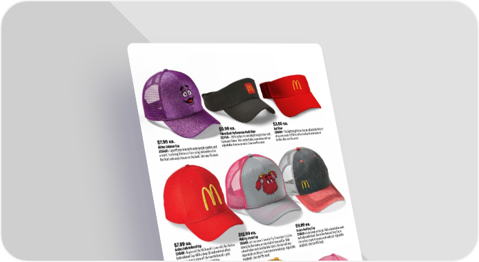 $9.99 ea. Token Black Performance Mesh Visor 3221158 • 100% polyester mesh lightweight visor with Screened Token. This comfortable cap comes with an adjustable closure on each. One size fits most. $3.99 ea. Red Visor 3196030 • This lightweight visor has an adjustable Velcro® strap and made of 100% cotton twill with embroidered Arches. One size fits most. $7.99 ea. Arches Embroidered Cap 3241401 • Represent the McDonald’s team with this Arches Embroidered Cap. With a deep 3D embroidered effect this cap is sure to show off the true McDonald’s gold. Adjustable backing. Embroidered Arches. $7.99 ea. Glitter Arches Cap 3241400 • Add sparkle to your ‘fit. The Glitter Arches Cap adds the extra glam your wardrobe needs. Stitched glitter Arches patch. Adjustable back. $9.99 ea. Arches Red/Grey Cap 3246415 • Look sharp on the job. With a breathable mesh and adjustable back, the Arches Red and Grey Cap is the perfect cap to keep you cool on the job. Adjustable snapback. One size fits most. $12.99 ea. Pink Fry Friend Cap 3246414 • Let everyone’s favorite Fry Friend (don’t tell the others) be the cherry on top of all of your outfits. With a breathable mesh and durable fabric, this hat will stay dependable on the go. Heat transferred design. Adjustable snapback. One size fits most. $4.99 ea. Embroidered Smile Cap 3220141 • 100% cotton lightweight red twill cap with updated embroidered Happy Meal smile. Features an adjustable closure. One size fits most. $4.99 ea. Gold Token Event Cap 3198001 • Coordinate your look with structured caps. Made of 100% cotton twill. Five-panel, relaxed fit. Adjustable Velcro strap. Embroidered token logo. One size fits most. $7.99 ea. Glitter Grimace Cap 3256441 • Cap off your look with some purple sparkle, and a smirk. Featuring Grimace’s face using embroidered on the front and snap closure on the back. One size fits most. 23 smkr.shop/S26
