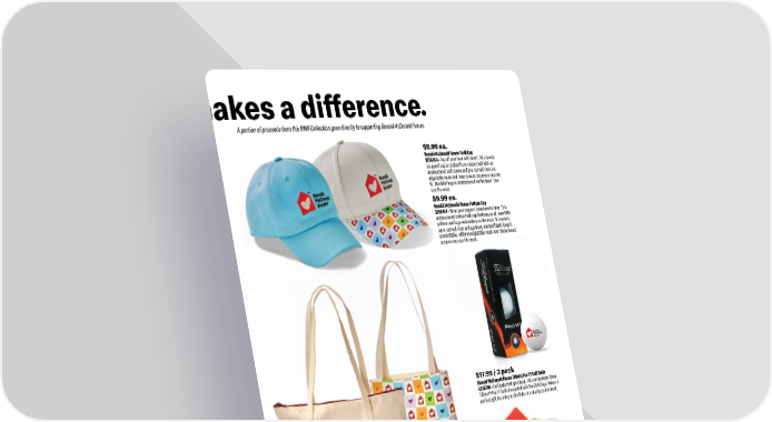 $9.99 ea. Ronald McDonald House Pattern Cap 3256454 • Wear your support from brim to brim. This unstructured cotton twill cap features an all - over RMH pattern and logo embroidery on the front. Six eyelets, a pre - curved visor and garment - washed fabric keep it comfortable, while an adjustable hook - and - loop closure ensures one size fits most. $15.99 ea. Ronald McDonald House Canvas Pocket Tote 2256706 • Carry compassion everywhere you go. This cotton canvas tote is printed edge - to - edge with the RMH pattern and horizontal logo. Has a generous pocket. Sturdy handles and embroidered accents make it durable and stylish. Measures 12-1/2"W × 14"H. $8.99 ea. Ronald McDonald House Twill Cap 3256453 • Top off your look with heart. This classic six - panel cap is crafted from cotton twill with an unstructured soft crown and pre - curved visor. An adjustable hook - and - loop closure ensures a custom fit. The RMH logo is embroidered on the front. One size fits most. $1.79 ea. Ronald McDonald House Lapel Pin 7256717 • Pin on pride for our mission. This lapel pin is die - struck with the RMH logo and sealed by an epoxy dome. Measures 1-1/4". $3.49 ea. Ronald McDonald House Keychain 7256718 • Carry the keys to caring. This molded PVC keychain showcases a colorful RMH motif on both sides and hangs from a 4 - link chain with split ring. Die - struck iron construction with soft enamel fill and black nickel plating adds durability. Measures 2" wide. $15.99 ea. Ronald McDonald House Zippered Boat Tote 2256707 • Tote your essentials with heart. This zippered boat tote is sewn from sturdy 10 - oz natural cotton canvas and features a contrasting color zipper and matching handles. It’s digitally printed with the RMH logo on the front pocket. Measures 19" W × 15" H × 5" D. $17.99 / 3 pack Ronald McDonald House Titleist Pro V1 Golf Balls 4256700 • Golf balls that give back. This set includes three Titleist® Pro V1 balls decorated with the RMH logo. Makes a perfect gift for a day on the links or a charity tournament. 47 A portion of proceeds from this RMH Collection goes directly to supporting Ronald McDonald House. smkr.shop/S26
