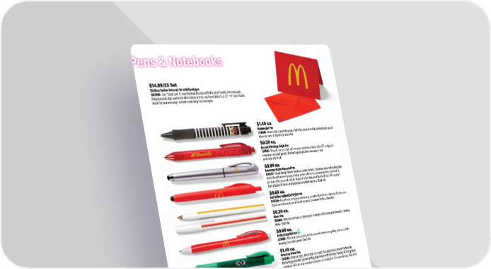 $14.99/25 Set 3D Gloss Arches Notecard Set with Envelopes 1265400 • Say “thank you” in true McDonald’s style with this set of twenty - five notecards. Printed on red 16pt cardstock with Golden Arches, each card folds to 3-1/2" × 5" and is blank inside for your message. Includes matching red envelopes. $5.99 ea. Cropped Arches Notebook 1231401 • Jot that down! You'll never lose a great idea again in these lined journals. Includes 70 lined pages. Measures 5" W x 7" H. $10.99 ea. Quarter Pounder Wrapper Task Pad 1251432 • Screen-printed task pad featuring the Quarter Pounder with Cheese wrapper design, perfect for any kind of quick and easy note-taking. Red tape binding along top edge. Measures 5-1/2" W x 8-1/2" H (136 pages / 68 sheets). $9.99 ea. Egg McMuffin Wrapper Bound Journal 1251433 • Egg McMuffin wrapper printed journal with red tape binding. Perfect for any kind of quick and easy note-taking! Measures 5-1/4" W x 7-3/4" H (136 pages / 68 sheets). $0.69 ea. Arches Recycled Pen 7231410 • This Arches recycled pen lets you write down everything you need while keeping your notes green. Black Ink. $0.39 ea. Straw Pen 1198003 • Who doesn’t love a reliable pen? A tribute to the famous McDonald's drinking straw. Black ink. $1.49 ea. Green Fry Friend Pen 1246708 • Write in style. The Green Fry Friend Pen with its Evermooth® hybrid ink technology provides a great writing experience with the easy flowing ink of a gel pen combined with the non-smudge resistance of a ballpoint. Screened design. Black ink. $0.99 ea. Basecamp Arches Recycled Pen 1246707 • Sleek design meets timeless Golden Arches. The Basecamp Arches Recycled Pen is the ultimate in keeping things green with its recycled properties. Black Ink. A portion of the proceeds will be donated to the Wounded Warrior Project®to support their mission to honor and empower wounded warriors. Black Ink. $0.69 ea. Red Arches Rubberized Stylus Pen 1246706 • Keep track, in digital and analog, with this Red Arches rubberized stylus pen. Stylus function works on all touch screens. Screened Arches. Black Ink. $1.49 ea. Hamburglar Pen 7241416 • Never steal a good idea again. With this smooth writing ballpoint pen, great ideas are sure to flow freely. Black Ink. $0.59 ea. Recycled Heritage Bright Pen 7241415 • Recycle classic style with recycled materials. Made with rPET using post- consumer recycled plastic, the Heritage Bright Pen takes every note with style. Black Ink. 32 1.800.421.4332 Notebooks $0.89 ea. NEW! i’m lovin’ it Recycled Gel Pen 1261411 • Perfect for jotting thoughts or lists. This eco-friendly retractable ballpoint pen is wrapped with the golden arches logo in vibrant colors. Smooth, smudge- resistant black ink has a comfortable grip and the clip keeps it handy.