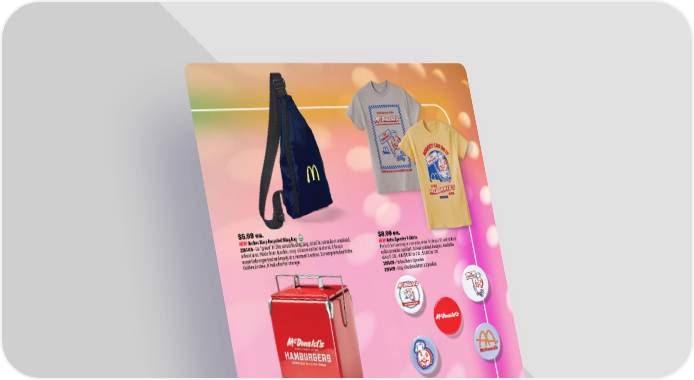 $3.99/5 pack NEW! Coast to Coast Classic Retro Speedee Button 5-Pack 7261415 • Pin on your Speedee pride. Crafted from USA steel and tin plate, these 1-1/2" round buttons display classic Speedee artwork in vibrant color. A sturdy metal backing and safety pin attachment secure it to hats, bags or lapels. $8.99 ea. NEW! Retro Speedee T-Shirts Perfect for layering or everyday wear. A classic fit and ribbed collar provides comfort. Screen printed designs. Available sizes S-3XL. Add $1.00 for 2XL, $3.00 for 3XL 3261418 • Yellow Retro Speedee 3261419 • Grey Checkered Retro Speedee $129.99 ea. NEW! Retro McDonald’s Red Metal Cooler 4261410 • Bring nostalgic fun to every outing. Exterior is constructed with hi-gloss industrial metal with aluminum accents. Features built-in bottle opener. 17 liter capacity. Not intended for direct food contact. $5.99 ea. NEW! Arches Navy Recycled Sling Bag 2261416 • Go “green” in this versatile sling bag, sized for errands or weekend adventures. Made from durable, easy - clean recycled material, it keeps essentials organized and ready at a moment’s notice. Screenprinted with the Golden Arches, it folds flat for storage. 3 All items marked with this symbol have sustainable attributes and can be found throughout the catalog. Need something custom? The Smilemakers’ Team can provide inspiration or bring your ideas to life. smkr.shop/custom Be the first to know about new arrivals, sales and exclusive offers. Sign up at: smkr.shop/signup smkr.shop/S26 Order Online: smilemakersonline.com or visit Email Us: mcdonalds@imsretail.com Call Us: 1.800.421.4332 Follow us: /smilemakersonline