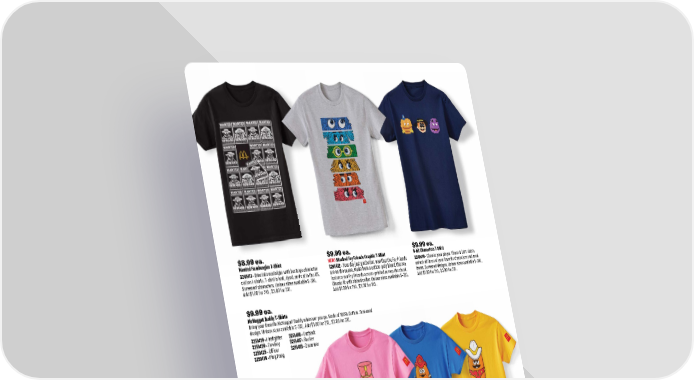 $9.99 ea. McNugget Buddy T-Shirts Bring your favorite McNugget Buddy wherever you go. Made of 100% Cotton. Screened design. Unisex sizes available S-3XL. Add $1.00 for 2XL, $3.00 for 3XL. 3251419 • Firefighter 3251418 • Outback 3251420 • Cowboy 3251417 • Rocker 3251425 • Officer 3251415 • Drummer 3251416 • Ping Pong $9.99 ea. 8-bit Characters T-Shirt 3241410 • Choose your player. These 8-bit t-shirts unlock all three of your favorite characters and meal items. Screened designs. Unisex sizes available S-3XL. Add $1.00 for 2XL, $3.00 for 3XL. $8.99 ea. Wanted Hamburglar T-Shirt 3241411 • Dive into nostalgia with heritage character cotton t-shirts. T-shirt is knit, dyed, and cut in the US. Screened characters. Unisex sizes available S-3XL. Add $1.00 for 2XL, $3.00 for 3XL. $9.99 ea. NEW! Stacked Fry Friends Graphic T-Shirt 3261412 • Your day just got better, now that the Fry Friends are on the scene. Made from a cotton-poly blend, this tee features our Fry Friends screen-printed across the chest. Classic fit with ribbed collar. Unisex sizes available S–3XL. Add $1.00 for 2XL, $3.00 for 3XL.