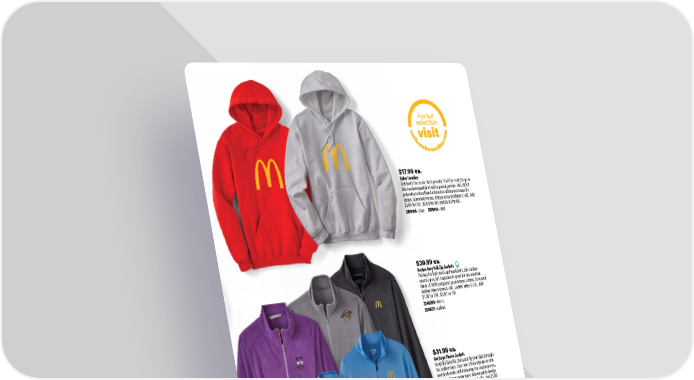 $39.99 ea. Arches Grey Full-Zip Jackets Perfect for both work and weekends, this carbon- neutral grey full-zip jacket is great for any weather. Made of 100% polyester performance fabric. Screened Arches. Men’s sizes S-3XL. Ladies’ sizes S-2XL. Add $1.00 for 2XL, $3.00 for 3XL. 3246303 • Men’s 3246211 • Ladies’ $31.99 ea. Heritage Fleece Jackets Keep the favorite character by your side through the chillier days. This men’s fleece jacket is slim and sleek while still delivering the insulation you need for those cooler days. Woven patch design on left chest. Available sizes in S-3XL. Add $1.00 for 2XL, $3.00 for 3XL. 3236309 • Men’s Grey Hamburglar 3236210 • Ladies’ Purple Grimace $17.99 ea. Value Hoodies Celebrate the iconic Arch proudly. You’ll be ready to go in this hooded sweatshirt with a pouch pocket. This 50/50 polyester/cotton blend eliminates pilling and keeps its shape. Screened Arches. Unisex sizes available S-4XL. Add $1.00 for 2XL, $3.00 for 3XL and $4.00 for 4XL. 3196016 • Grey 3196015 • Red $19.99 ea. NEW! Arches Light Blue 1/4 Zip Pullover Perfect for days when you need an extra layer. Crafted from 100% polyester interlock, this athletic quarter zip offers moisture-management properties and UPF 40+ protection to keep you cool and dry. Screen printed Golden Arches on left chest. Available sizes S-3XL. Add $1.00 for 2XL, $3.00 for 3XL. 3261310 • Men’s 3261210 • Ladies’ 17 smkr.shop/S26