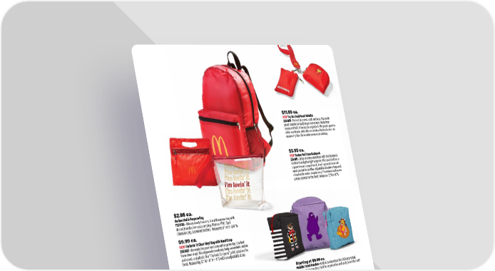 Starting at $8.99 ea. Modular Travel Pouches • Grab all 3 characters for a full set! Printed modular zipper pouches. Built for organization and ready to be filled with anything you need on the go. 2251431 • Small Birdie 2251432 • Medium Hamburglar 2251433 • Large Grimace $5.99 ea. NEW! Arches Red Value Backpack 2261411 • Strap on some adventure with this backpack. Crafted from lightweight polyester, this pack features a zippered main compartment, front zip pocket and side mesh pocket for bottles. Adjustable shoulder straps and a top handle make carrying easy. The Golden Arches are screen-printed on the front. Measures 12"W x 16"H. $17.99 ea. Big Mac Hip Pack 2231401 • Live the Big Mac life. Includes two zippered pock- ets. You’ll have everything you need safely secured to you with no extra baggage. Measures 6-1/4" W x 4" H x 2" D. $4.99 ea. Grimace Hip Pack 2236712 • Stay hip. This Grimace hip pack keeps what you need on hand and within reach. Screened design. Measures 13"W x 5-1/2"H. $11.99 ea. NEW! Fry Box Dual Pouch Wristlet 2261405 • Perfect for cards, cash and keys, this multi- pouch wristlet is ready to go everywhere. Made from laminated twill, it keeps you organized. The pouch sports a white wordmark, while the second has Golden Arches. An enamel Fry Box charm adds some extra whimsy. $2.99 ea. Arches Multi-Purpose Bag 7221156 • Always ready to carry. A multipurpose bag with die cut handles for easy carrying. Made of PVC. Spot Clean/Air Dry. Screened Arches. Measures 8" H x 9-3/4" W. $9.99 ea. NEW! i’m lovin’ it Clear Vinyl Bag with Hand Strap 2261407 • Be ready for your next concert or game day. Crafted from clear vinyl, this zippered crossbody keeps essentials visible and event - compliant. Our “i’m lovin’ it repeat” print splashes the front. Measuring 12" W × 8" H × 4" D with an adjustable strap. $14.99 ea. NEW! Tumbled Arches Fanny Hip Pack 2261408 • Rock your waist with hip pack swagger. Crafted from polyester with sturdy stitching and zippers, this hip pack combines function and fashion-forward flair. The Golden Arches pattern is dye-sublimated for vibrant, lasting color. Measures 8" W - 5" H, it’s perfect for errands, festivals and every other day. 30 1.800.421.4332