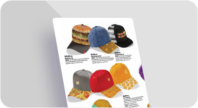 $9.99 ea. Hamburglar Ransom Cap 3251403 • Sure to keep you cool without taking your style. Brushed cotton with mesh back and printed and dye sublimated decorations. Adjustable snapback. One size fits most. $10.99 ea. Big Mac Retro Cap 3251408 • Wear the Big Mac classic look. Breathable poly twill cap with sublimated decoration and woven tag. Adjustable snapback. One size fits most. $8.99 ea. Denim Heritage Logo Cap 3251407 • A subtle look back at the rich history of McDonald’s logos, this cap is the perfect forward thinking statement for any outfit. Denim cap with sublimated bill. Adjustable snapback. One size fits most. $6.99 ea. Food Favorite Caps Stay cool and stylish, no matter the shift! This breathable poly twill cap features a dye sublimated bill, a woven applique for extra flair, and an adjustable snapback for the perfect fit—one size fits most. 3251405 • Egg McMuffin Wrapper Cap 3251406 • Quarter Pounder Wrapper Cap 3251404 • McNuggets Cap $10.99 ea. Token Terry Bucket Hat 3251409 • Top off your look with a hat that’s as cool as you are! This Terry Cloth Bucket Hat features a woven applique decoration and a comfy fit—one size fits most. $14.99 ea. Red Sherpa Bucket Hat with Fry Box Icon 3256433 • This is going to be your head’s new fave. Featuring red sherpa fabric, this bucket hat is sure to keep you warm. Embroidered fry box icon adorns front. One size fits most. $19.99 ea. Crochet Burger Beanie 3256434 • Oh yeah, this is going to turn some heads. And it will keep you warm on those cooler days too. This unique crocheted beanie replicates the McDonald’s Quarter Pounder with Cheese Deluxe. One size fits most. 26 1.800.421.4332
