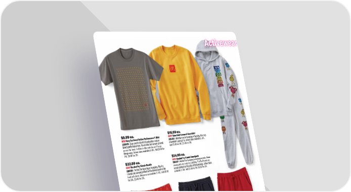 $24.99 ea. NEW! Stacked Fry Friends Sweatpants 3261417 • Perfect for lounging or running errands, these sweatpants are ready for anything. The Fry Friends are screen printed on the sides of the pant legs. Unisex sizes available S-3XL. Add $1.00 for 2XL, $3.00 for 3XL. $15.99 ea. NEW! Token Gold Crewneck Sweatshirt 3261424 • Whether you’re lounging or layering, this cozy crewneck is your go-to. Unisex sizes available S-3XL. Add $1.00 for 2XL, $3.00 for 3XL. $19.99 ea. NEW! Tumbled Arches Lounge Shorts 3261415 • Kick back in Golden Arches bliss. These red shorts are made of a polyblend for soft stretch. The Golden Arches pattern is dye-sublimated for vibrant, lasting color. An elastic waistband makes them perfect for sleeping or relaxing. Unisex sizes available S-3XL. Add $1.00 for 2XL, $3.00 for 3XL. $21.99 ea. NEW! Coast to Coast Heritage Navy Lounge Shorts 3261421 • Bring on warmer weather in these fleece shorts. Crafted from ring-spun cotton and polyester fleece, these navy shorts offer a relaxed fit with an elastic waistband and shoestring drawcord. Screen-printed down the leg add playful flair. Unisex sizes available S-2XL. Add $1.00 for 2XL. $19.99 ea. NEW! Arches Red Lounge Shorts 3261427 • Find some outdoor fun in these fleece shorts. Crafted from ring-spun cotton/polyester fleece with a cotton face, they have an elastic waistband and shoestring drawcord. A screen-printed Golden Arches at the Bottom corner adds signature style. Unisex sizes available S-2XL. Add $1.00 for 2XL. $32.99 ea. NEW! Stacked Fry Friends Hoodie 3261414 • Perfect for layering or lounging. The Fry Friends are screen printed on the sleeves and on the front left chest. Unisex sizes available S-3XL. Add $1.00 for 2XL, $3.00 for 3XL. $9.99 ea. NEW! Grey Scattered Arches Performance T-Shirt 3261410 • Stay cool in this 65/35 polyester–cotton blend performance tee. The Arches are screen-printed across the front. A ribbed collar and classic fit keep things easy. Unisex sizes available S-3XL. Add $1.00 for 2XL, $3.00 for 3XL. 15 Activewear smkr.shop/S26