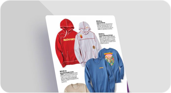 $16.99 ea. i’m lovin’ it Cream Crewneck 3256420 • This crewneck flips the classic McDonald’s slogan into a street-style essential front print, soft feel, and ready to layer on for cooler days. Made from a comfy blend of 50% cotton and 50% polyester. Screened i’m lovin’ it repeat art. Unisex sizes available S-3XL. Add $1.00 for 2XL, $3.00 for 3XL. $21.99 ea. McDonaldland Steel Blue Crewneck 3256421 • Live the McDonaldland life! Features McDonaldland arched word on front chest and graphic on back using direct to film transfer technique. Made of cotton/polyester blend. Unisex sizes available S-3XL. Add $1.00 for 2XL, $3.00 for 3XL. $29.99 ea. Red Contrast Stitch Hoodie 3256701 • Where retro meets restaurant royalty. Red hoodie with contrasting stitch. Made from a comfy blend of 60% cotton and 40% polyester. Features screened wordmark across front chest. Unisex sizes available S-3XL, add $1.00 for 2XL, $3.00 for 3XL. $22.99 ea. McDonaldland Grey Crewneck 3256418 • McDonaldland takes you back without saying a word. This heathered grey crewneck is made from a comfy blend of 50% cotton and 50% polyester. Decorated with direct to film transferred design. Unisex sizes available S-3XL. Add $1.00 for 2XL, $3.00 for 3XL. $29.99 ea. Scattered Icon White Contrast Stitch Hoodie 3256702 • A tasty twist on classic flair. White hoodie with contrasting stitch is made from 60% cotton and 40% polyester. Features Big Mac icon, Fry Box icon, Token, and Happy Meal Smile icon screen printed in various locations. Unisex sizes available S-3XL, add $1.00 for 2XL, $3.00 for 3XL 16 1.800.421.4332