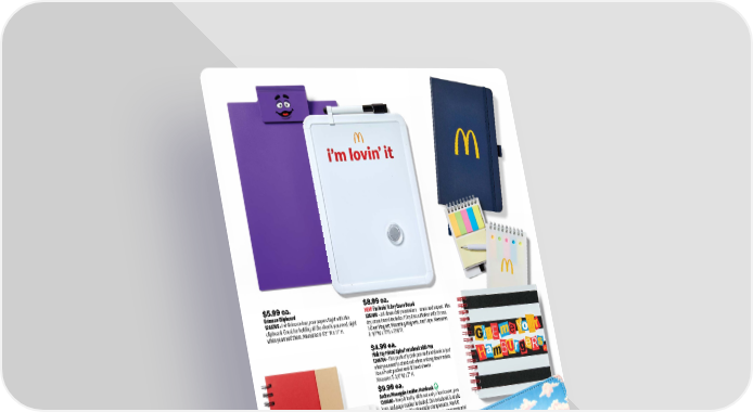 $9.99 ea. Arches Pineapple Leather Notebook 1241400 • Keep it fruity. With not only a hardcover, pen loop, and page marker included, this notebook is made with 30% sustainable pineapple components. Mark it down and keep it green. 1% of profits go to environmental nonprofits. Measures 5-1/2" W x 8-1/2" H. $2.99 ea. Spiral Jotter Set 1231403 • Keep everything in order. Sticky flags in five fun neon colors. PVC cover and matching shorty pen with flip clip in elastic pen loop. Measures 3-1/2" W x 5-1/4" H. $4.99 ea. Pink Fry Friend Spiral Notebook with Pen 1246704 • This perfectly pink pen and notebook is just what you need to stand out when writing down notes. Has a front pocket and 70 lined sheets. Measures 5-3/4" W x 7" H. $5.99 ea. Grimace Clipboard 1246705 • Let Grimace hug your papers tight with this clipboard. Great for holding all the sheets you need, right when you need them. Measures 8-1/2" W x 11" H. $2.99 ea. Arches Red Recycled Magnetic Journal 1246700 • Stay organized the sustainable way. Made of various recycled materials, this Magnetic Journal comes with a magnetic clasp, sticky sheets, sticky flags, and 70 lined sheets of paper. Screened Arches. Measures 5-3/4" W x 7-1/4" H. $8.99 ea. NEW! i’m lovin’ it Dry Erase Board 1261410 • Jot down daily reminders – erase and repeat. This dry erase board includes 1 Dry Erase Marker with Eraser, 1 Clear Magnet, Mounting Magnets, and Tape. Measures 8-1/2"W x 11"H x 7/16"D. $7.99 ea. Hamburglar Ransom Note Square Notebook 1251431 • The lay-flat ease of a coil-bound notebook, perfect for any kind of quick and easy note-taking. Fun, red coil and custom printed “Give Me Your Hamburgers” ransom note message on the Hamburglar stripe. Measures 5-1/4" W x 5-1/4" H; 68 Sheets (136 Pages). $12.99 ea. NEW! McDonaldland 3D PVC Journal 1261406 • Jot down your thoughts with swag. This journal’s cover combines vegan leather with a PVC patch for an extra cool finish. Inside you’ll find 200 lined pages for notes, lists and sketches. Compact yet sturdy, it arrives ready for gifting or daily use—and serves as a subtle nod to McDonald’s heritage. Measures 6"W x 8"H.
