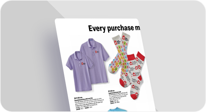 $27.99 ea. Ronald McDonald House Silk Touch Polo Style with purpose. Made from a soft and durable poly-cotton pique, this polo features a flat-knit collar and three-button placket. Finished with an embroidered RMH logo on the left chest. Sizes available S–3XL. Add $2.00 for 2XL, $3.00 for 3XL. 3256300 • Men’s 3256200 • Ladies’ $7.99 ea. Ronald McDonald House Socks Add a little pep in every step. These full knit socks are a comfortable blend of 75% cotton, 22% nylon and 3% spandex and feature an all - over RMH pattern. One - size - fits - most. 3256455 • RMH Logo 3256456 • RMH Pattern 46 1.800.421.4332 Every purchase m $7.99 ea. Ronald McDonald House T-Shirts Colorful comfort for all. These unisex crewneck tees are made of 100% cotton and feature a screen printed RMH logo on the chest. Unisex sizes available S–3XL. Add $2.00 for 2XL, $3.00 for 3XL. 3256444 • Lavender 3256442 • Aqua 3256443 • Lime