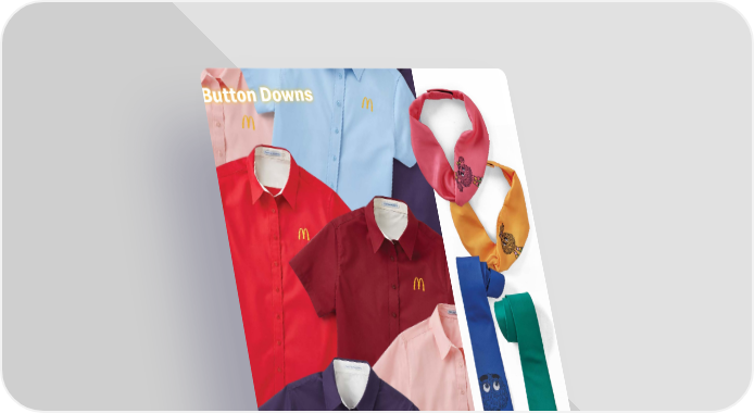 For long-sleeve options $21.99 ea. Short Sleeve Button Downs This shirt was tailor-made for all you McDonald’s pros out there. Made of 55/45 poly/cotton blend short sleeve button downs feature a left chest pocket for men and a tailored fit through the torso for ladies. Embroidered Arches on left chest. Sizes S-4XL. Add $1.00 for 2XL-4XL. 3236212 • Ladies’ Purple 3236310 • Men’s Purple 3202719 • Ladies’ Burgundy 3203717 • Men’s Light Blue 3196235 • Ladies’ Red 3196335 • Men’s Red 3202717 • Ladies’ Light Blue 3202718 • Ladies’ Pink $9.99 ea. NEW! Fry Friend Ties Add a playful splash of personality to your closet. Made from smooth polyester, these ties have vibrant colors using dye-sublimation. Designed exclusively for McDonald’s. 3261202 • Pink Scarf Tie 3261203 • Yellow Scarf Tie 3261304 • Blue Neck Tie 3261305 • Green Neck Tie 8 1.800.421.4332 Downs