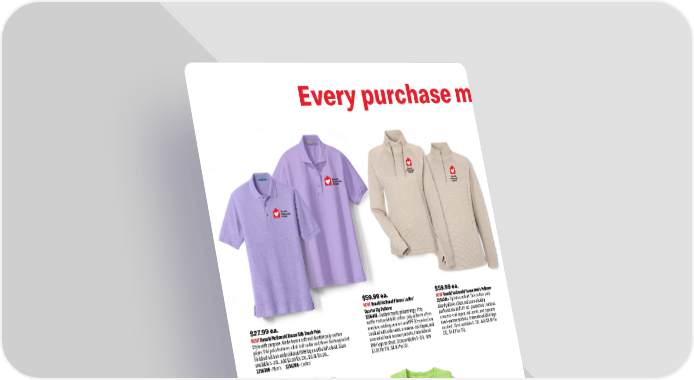 $27.99 ea. NEW! Ronald McDonald House Silk Touch Polo Style with purpose. Made from a soft and durable poly-cotton pique, this polo features a flat-knit collar and three-button placket. Finished with an embroidered RMH logo on the left chest. Sizes available S3XL. Add $2.00 for 2XL, $3.00 for 3XL. 3256300 Mens 3256200 Ladies $59.99 ea. NEW! Ronald McDonald House Mens Pullover 3256201 Zip into comfort. This cottonpoly blend pullover offers moisture-wicking performance and UPF 50+ protection. Features a reverse-coil zipper, side vents, and zippered hand-warmer pockets. Embroidered RMH logo on chest. Sizes available S3XL. Add $3.00 for 2XL, $4.00 for 3XL. $59.99 ea. NEW! Ronald McDonald House Ladies Quarter Zip Pullover 3256448 Fashion meets philanthropy. This waffle-textured 60/40 cottonpoly pullover offers moisture-wicking comfort and UPF 50+ protection. Finished with side vents, a reverse-coil zipper, and concealed hand-warmer pockets. Embroidered RMH logo on chest. Sizes available S3XL. Add $3.00 for 2XL, $4.00 for 3XL. 2 1.800.421.4332 Every purchase m $7.99 ea. NEW! Ronald McDonald House Unisex T-Shirt Colorful comfort for all. These unisex crewneck tees are made of 100% cotton and feature a screenprinted RMH logo on the chest. Sizes available S3XL. Add $2.00 for 2XL, $3.00 for 3XL. 3256444 Lavender 3256442 Aqua 3256443 Lime