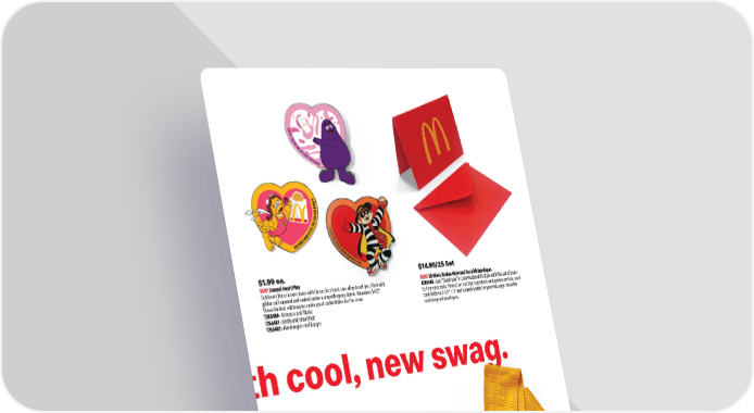 $1.99 ea. NEW! Enamel Heart Pins Celebrate these iconic duos with these die struck zinc alloy heart pin, filled with glitter soft enamel and sealed under a smooth epoxy dome. Measures 1-1/2". These limited - edition pins make great collectibles for the crew. 7265400 Grimace and Shake 7265401 Birdie and Breakfast 7265402 Hamburglar and Burger $10.99 ea. Color-Block Knit Pom Beanie 3256428 Keep your head warm and your style cool. This soft, custom-knit pom beanie features a token tag cuff. One size fits most. $14.99 ea. Color-Block Knit Scarf 3256430 Bundle Up! Winters no match for this cozy knit scarf. Featuring gold and red colorblock. Embroidered Arches. One size fits most. Measures 15 1/2"W x 70" L. $9.99 ea. Color-Block Knit Gloves 3256429 A snug fit with soft gloves is just what you need to get through any Winter season. Features embroidered Arches. One size fits most. $14.99/25 Set NEW! 3D Gloss Arches Notecard Set with Envelopes 1265400 Say thank you in true McDonalds style with this set of twen- tyfive notecards. Printed on red 16pt cardstock with golden arches, each card folds to 3-1/2" 5" and is blank inside for your message. Includes matching red envelopes. 7 smilemakersonline.com