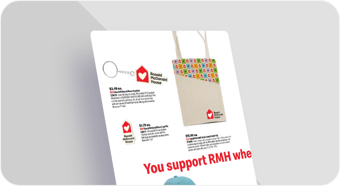 $9.99 ea. NEW! Ronald McDonald House Pattern Cap 3256454 Wear your support from brim to brim. This unstructured cotton twill cap features an all - over RMH pattern and logo embroidery on the front. Six eyelets, a pre - curved visor and garment - washed fabric keep it comfortable, while an adjustable hook - and - loop closure ensures one size fits most. $15.99 ea. NEW! Ronald McDonald House Canvas Pocket Tote 2256706 Carry compassion everywhere you go. This cotton canvas tote is printed edge - to - edge with the RMH pattern and horizontal logo. Has a generous pocket. Sturdy handles and embroidered accents make it durable and stylish. Measures 12-1/2"W 14"H. $8.99 ea. NEW! Ronald McDonald House Twill Cap 3256453 Top off your look with heart. This classic six - panel cap is crafted from cotton twill with an unstructured soft crown and pre - curved visor. An adjustable hook - and - loop closure ensures a custom fit. The RMH logo is embroidered on the front. One size fits most. $1.79 ea. NEW! Ronald McDonald House Lapel Pin 7256717 Pin on pride for our mission. This lapel pin is die - struck with the RMH logo and sealed by an epoxy dome. Measures 1-1/4". $3.49 ea. NEW! Ronald McDonald House Keychain 7256718 Carry the keys to caring. This molded PVC keychain showcases a colorful RMH motif on both sides and hangs from a 4 - link chain with split ring. Die - struck iron construction with soft enamel fill and black nickel plating adds durability. Measures 2" wide. 4 1.800.421.4332 You support RMH whe