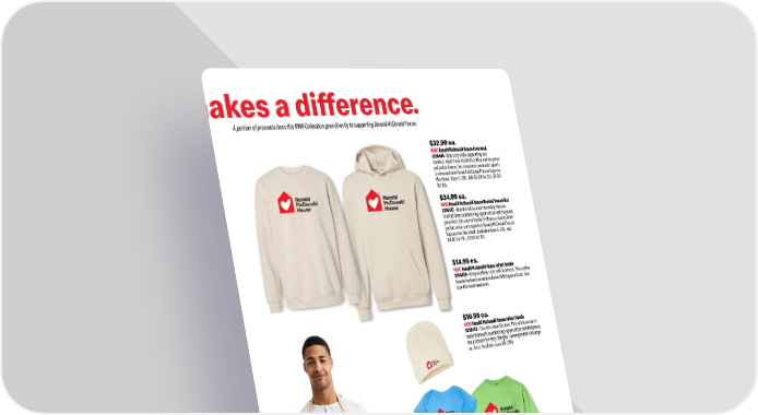 $32.99 ea. NEW! Ronald McDonald House Crewneck 3256446 Stay cozy while supporting our families. Made from 70/30 US cotton and recycled polyester fleece, this crewneck sweatshirt sports a screenprinted Ronald McDonald House logo on the chest. Sizes S3XL. Add $3.00 for 2XL, $4.00 for 3XL. $34.99 ea. NEW! Ronald McDonald House Hooded Sweatshirt 3256447 Warmth with a heartwarming mission. Crafted from combed ring - spun cotton and recycled polyester, this unisex hoodie features a classic front pocket and a screenprinted Ronald McDonald House logo across the chest. Available sizes S3XL. Add $3.00 for 2XL, 43.00 for 3XL. $7.99 ea. NEW! Ronald McDonald House Lime Youth T-Shirt 3256445 Little heroes love this happy tee. Crafted from 100% cotton, this youth tee features a screenprinted RMH logo on the chest. Youth sizes available S-XL. $15.99 ea. NEW! Ronald McDonald House Bib Apron 3256451 Cooking up care never looked better. Made from 100% organic cotton with self - fabric neckband and ties, this bib apron supports responsibly grown cotton. RMH logo is embroidered on the front cuff. One size fits most. $10.99 ea. NEW! Ronald McDonald House Infant Onesie 3256449 Tiny tots show big love. This infant onesie is made from soft combed ring - spun cotton and features a snap closure for easy changes. Screenprinted RMH logo on chest. Available sizes NB24M. $14.99 ea. NEW! Ronald McDonald House Infant Beanie 3256450 Keep any baby cozy with kindness. This cotton beanie features an embroidered RMH logo on front. One size fits most newborns. 3 smilemakersonline.com A portion of proceeds from this RMH Collection goes directly to supporting Ronald McDonald House.